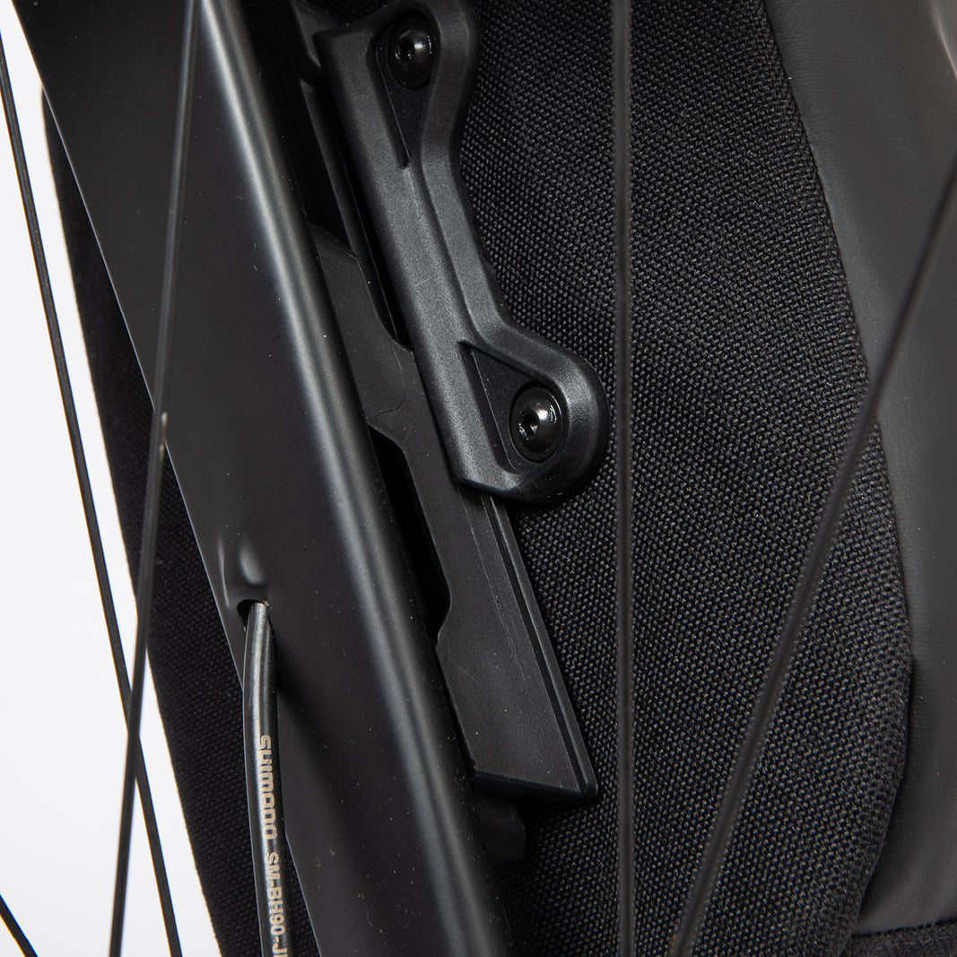 The Restrap Switch Pannier uses an injection moulded clip that drops directly into the Hiplok x Restrap Switch mount and a flexible back plate that provides structure to the pannier, while also dampening vibration and minimising rattles over rough ground.